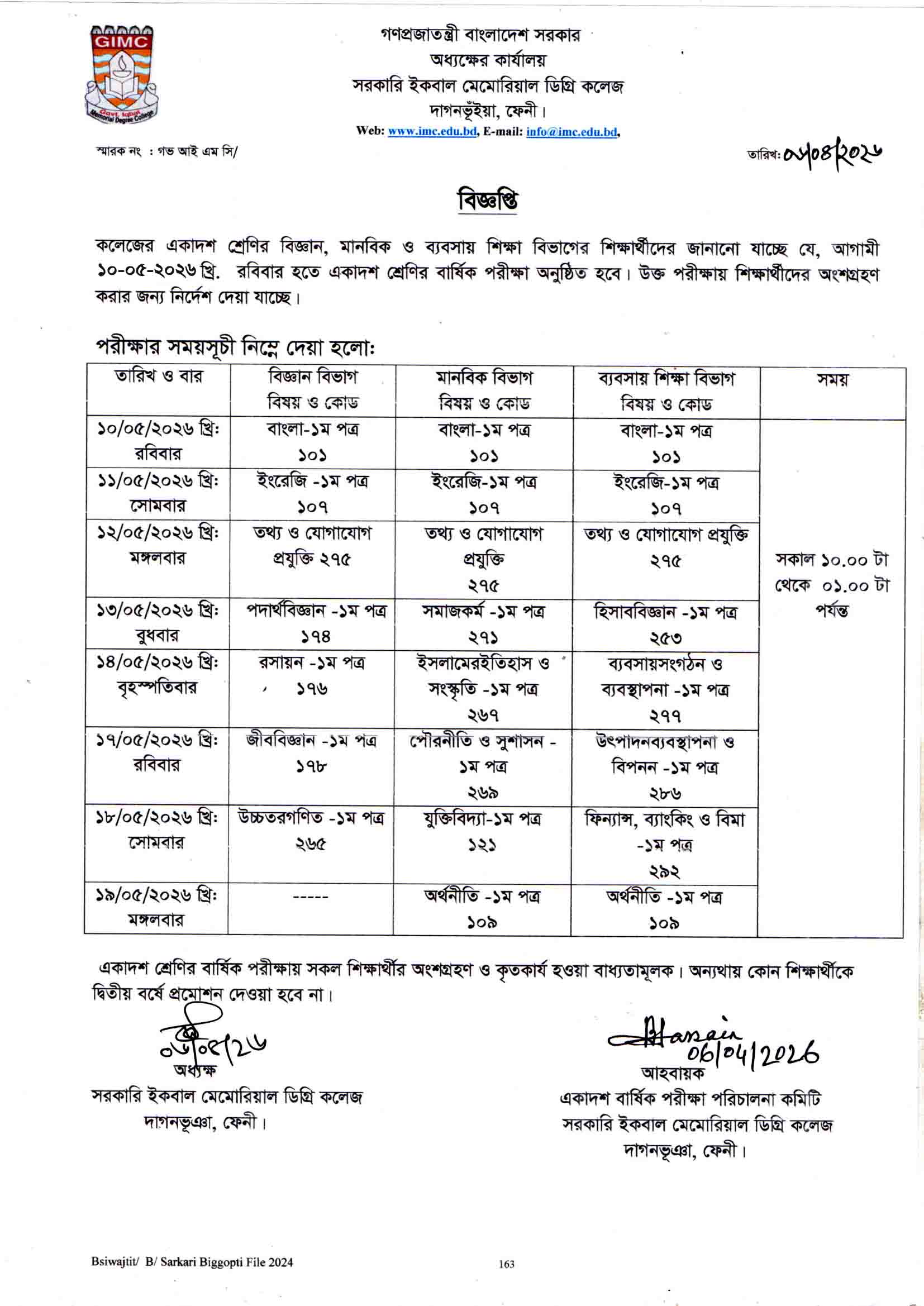 - একাদশ শ্রেণির মাবিক, বিজ্ঞান ও ব্যবসায় শিক্ষা বিভাগের বার্ষিক পরীক্ষার রুটিন - ২০২৬