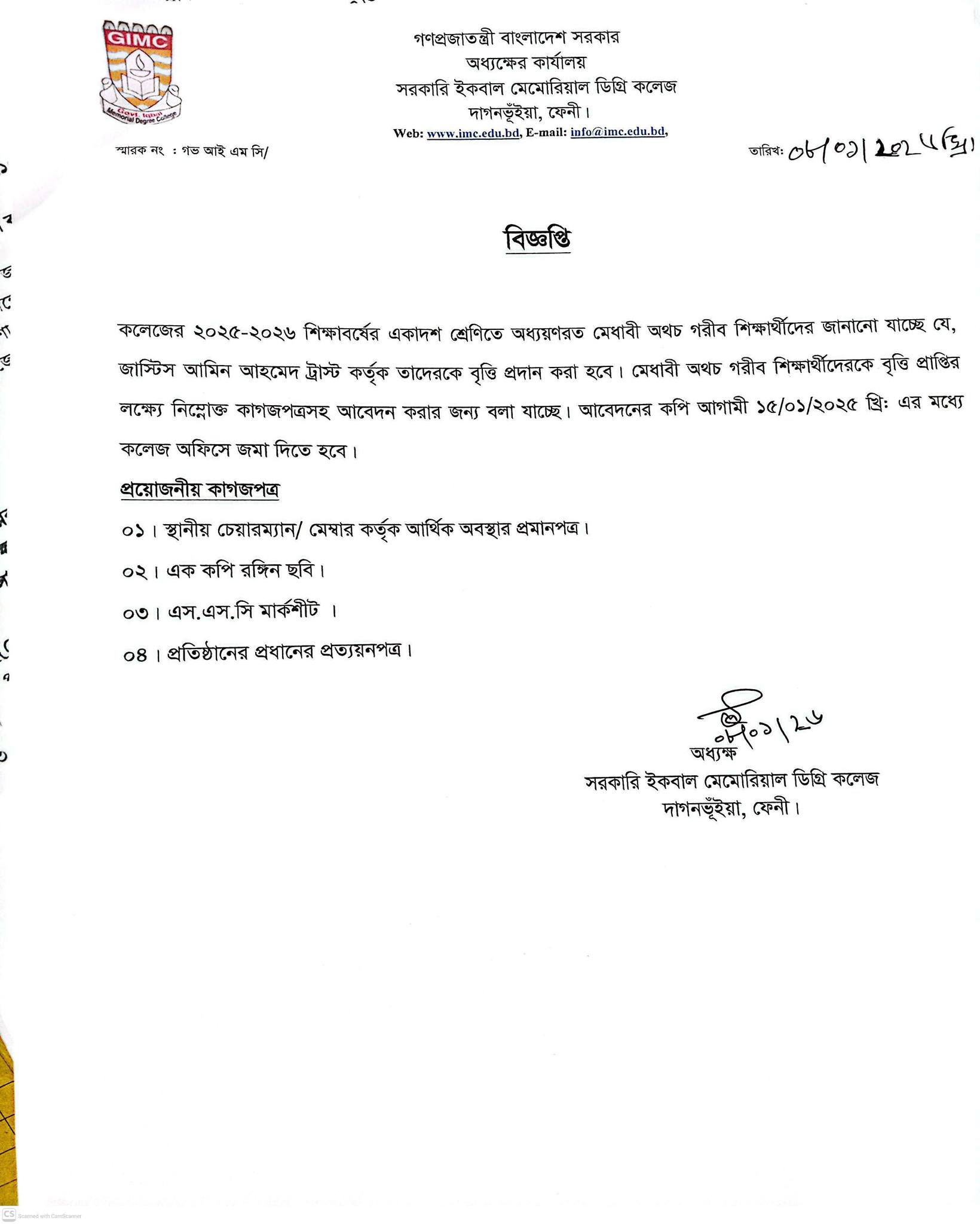 অসচ্ছল মেধাবী শিক্ষার্থীদের ভর্তি সহায়তা প্রদান সংক্রান্ত বিজ্ঞপ্তি। |