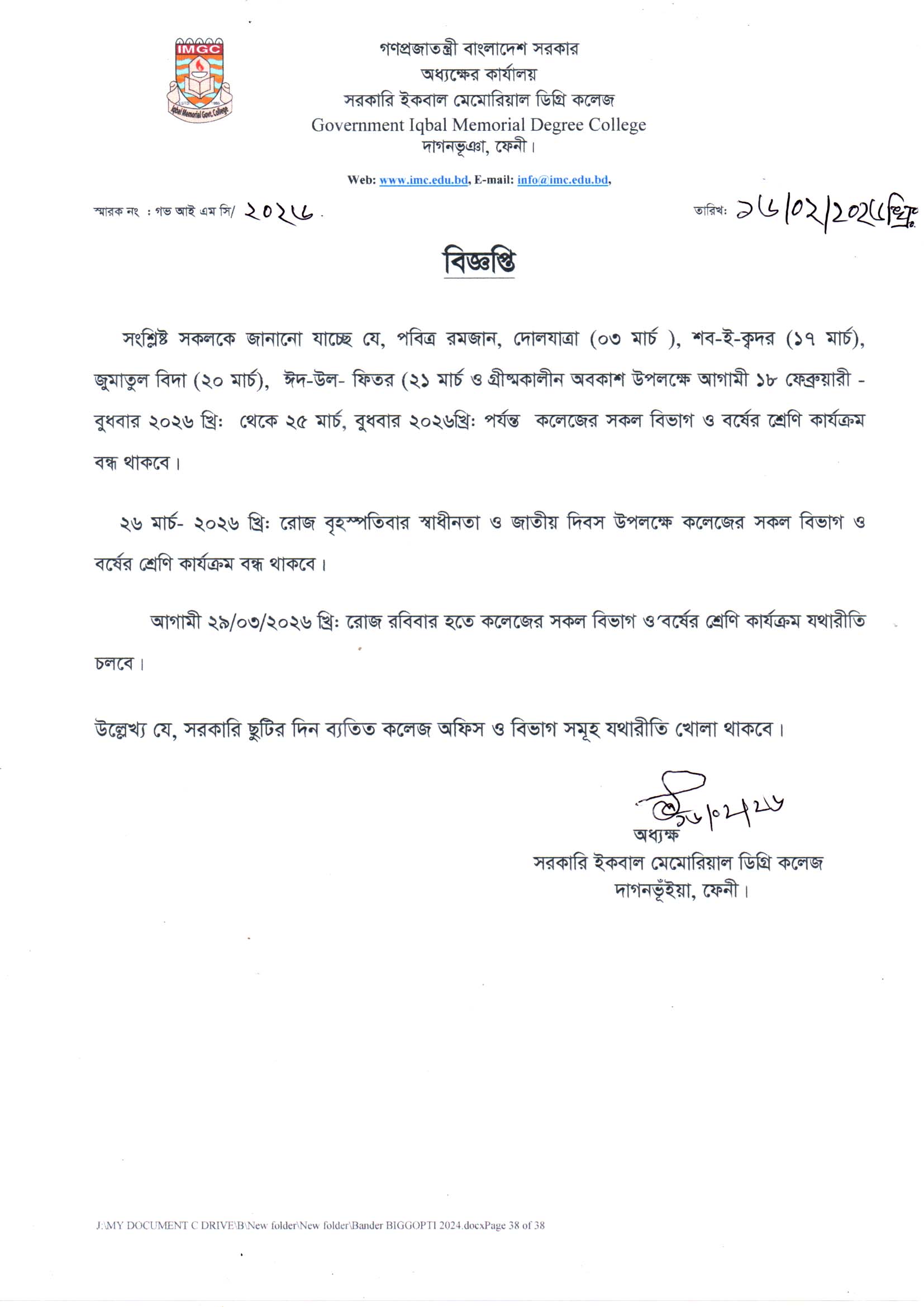 শ্রেণি কার্যক্রম বন্ধ সংক্রান্ত বিজ্ঞপ্তি - ২০২৬ |