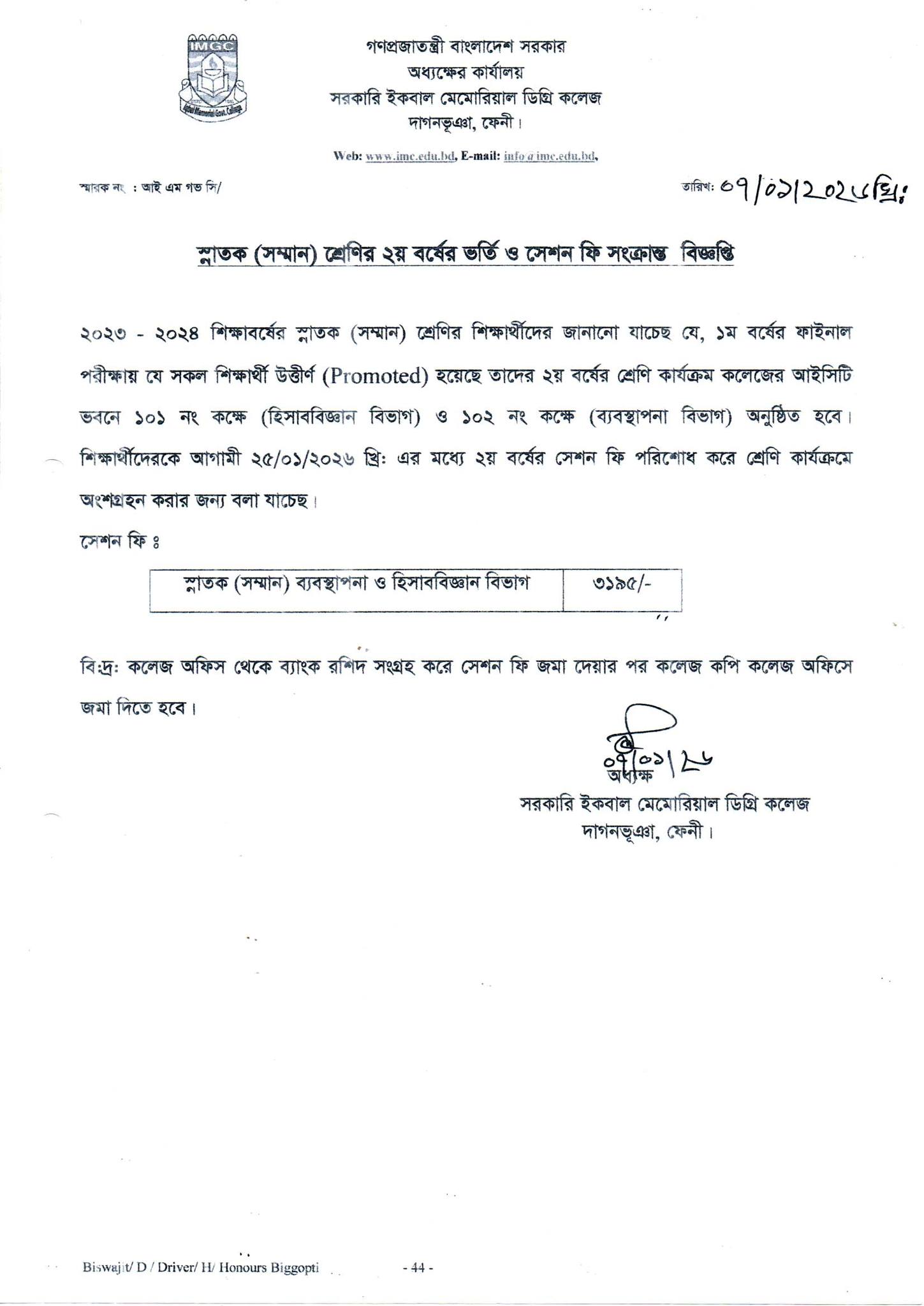 ২০২৩-২০২৪ শিক্ষাবর্ষের একাদশ শ্রেণিতে ভর্তিকৃত বিজ্ঞান বিভাগের শিক্ষার্থীদের রেজিষ্ট্রেশন প্রিন্ট আউট কপিতে স্বাক্ষরদানের বিজ্ঞপ্তি। |