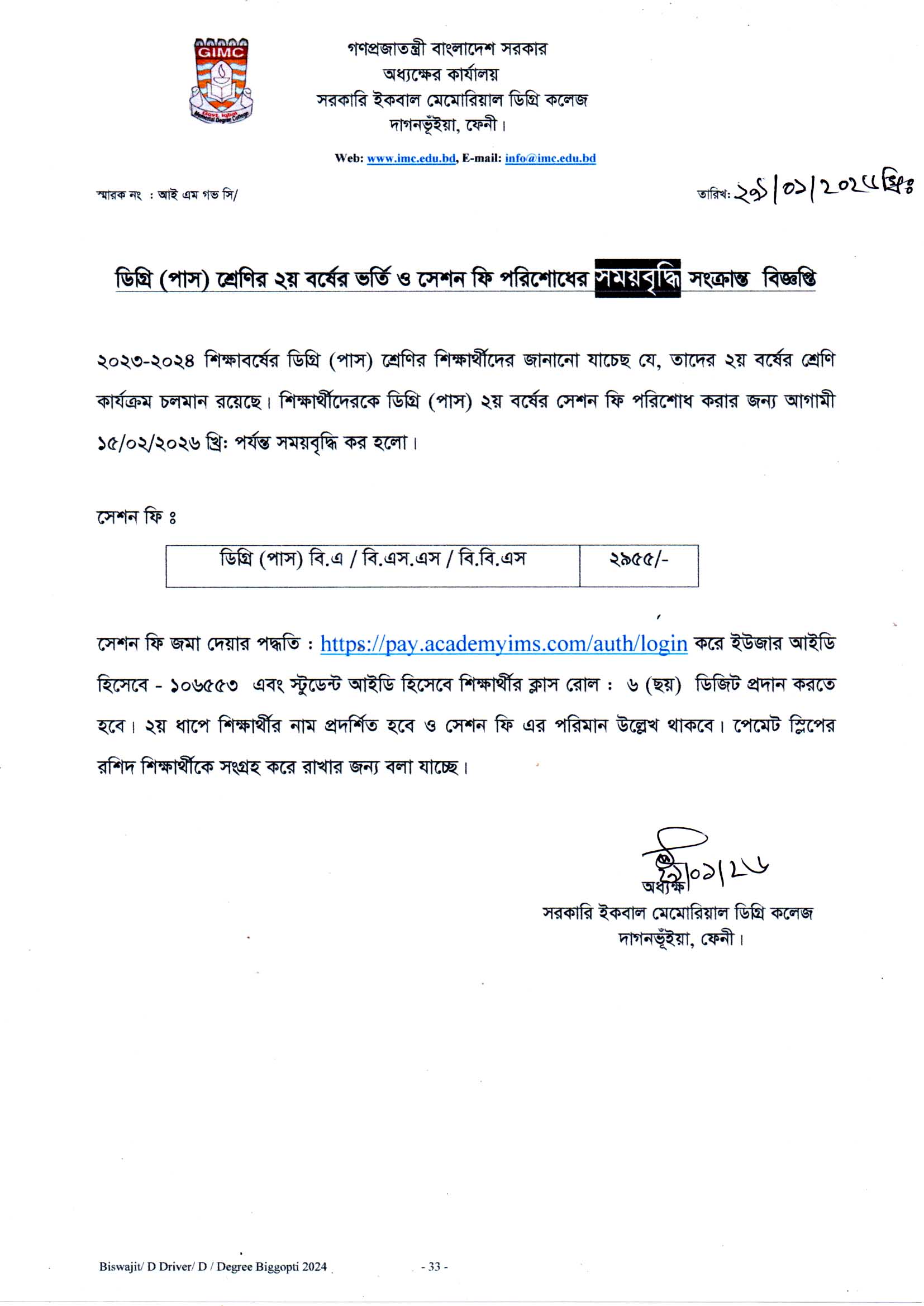 ২০২৩ - ২০২৪ শিক্ষাবর্ষের ডিগ্রি (পাস) ২য় বর্ষের সেশন ফি প্রদানের সময়বৃদ্ধি সংক্রান্ত বিজ্ঞপ্তি |