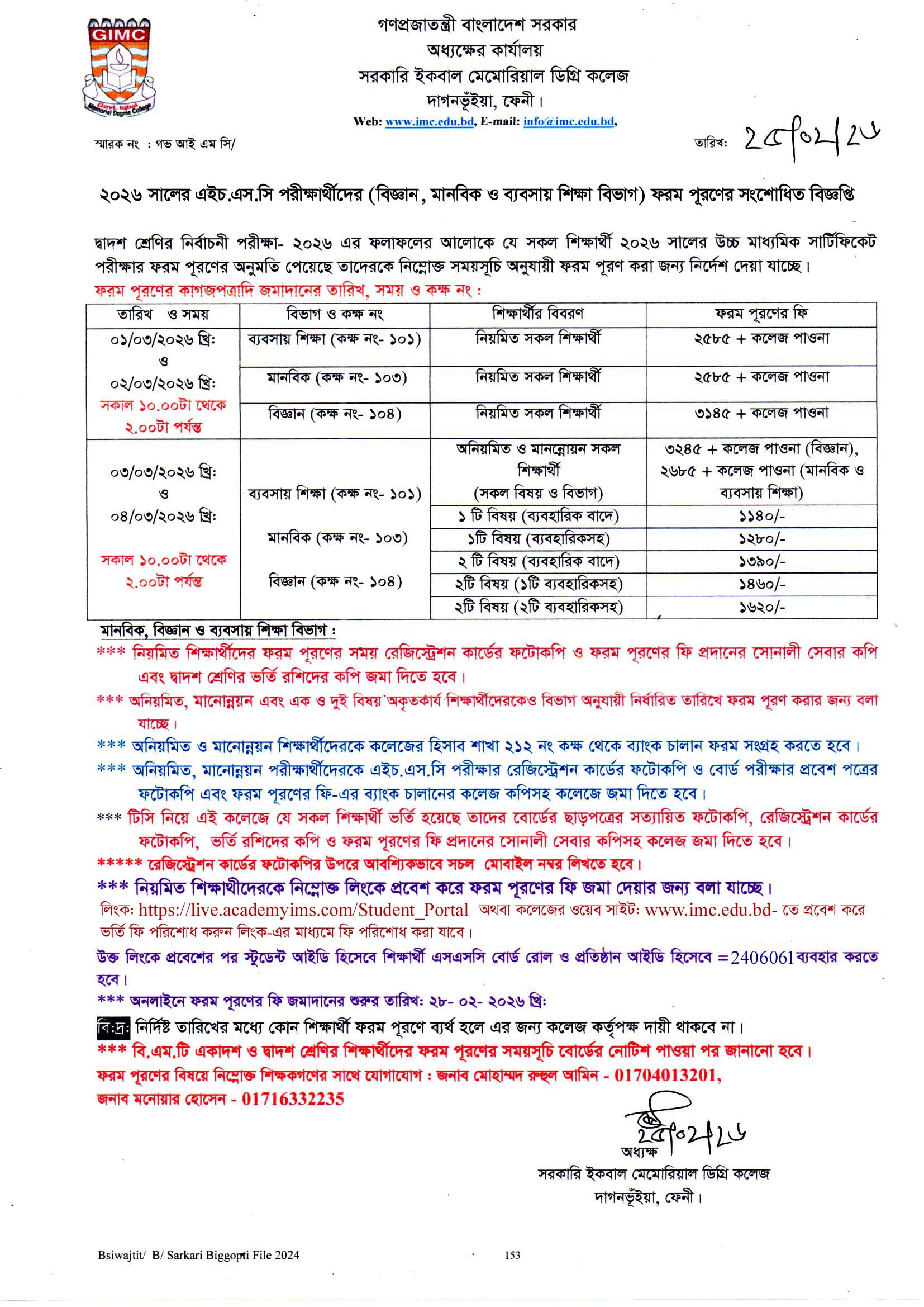 ২০২৬ সালের উচ্চ মাধ্যমিক পরীক্ষার ফরম পূরণের সংশোধিত বিজ্ঞপ্তি (মানবিক, বিজ্ঞান ও ব্যবসায় শিক্ষা বিভাগ) Download