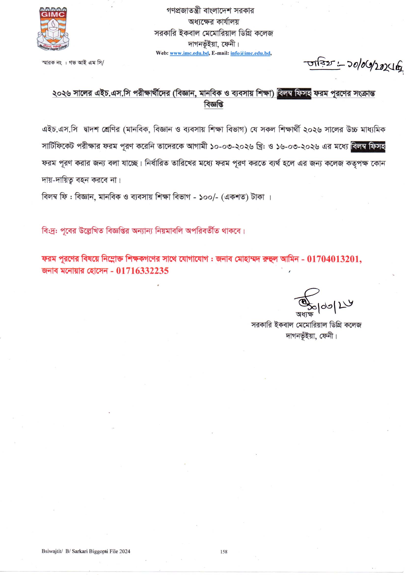 - এইচ.এস.সি পরীক্ষা- ২০২৬ এর বিলম্ব ফিসহ ফরম পূরনের বিজ্ঞপ্তি