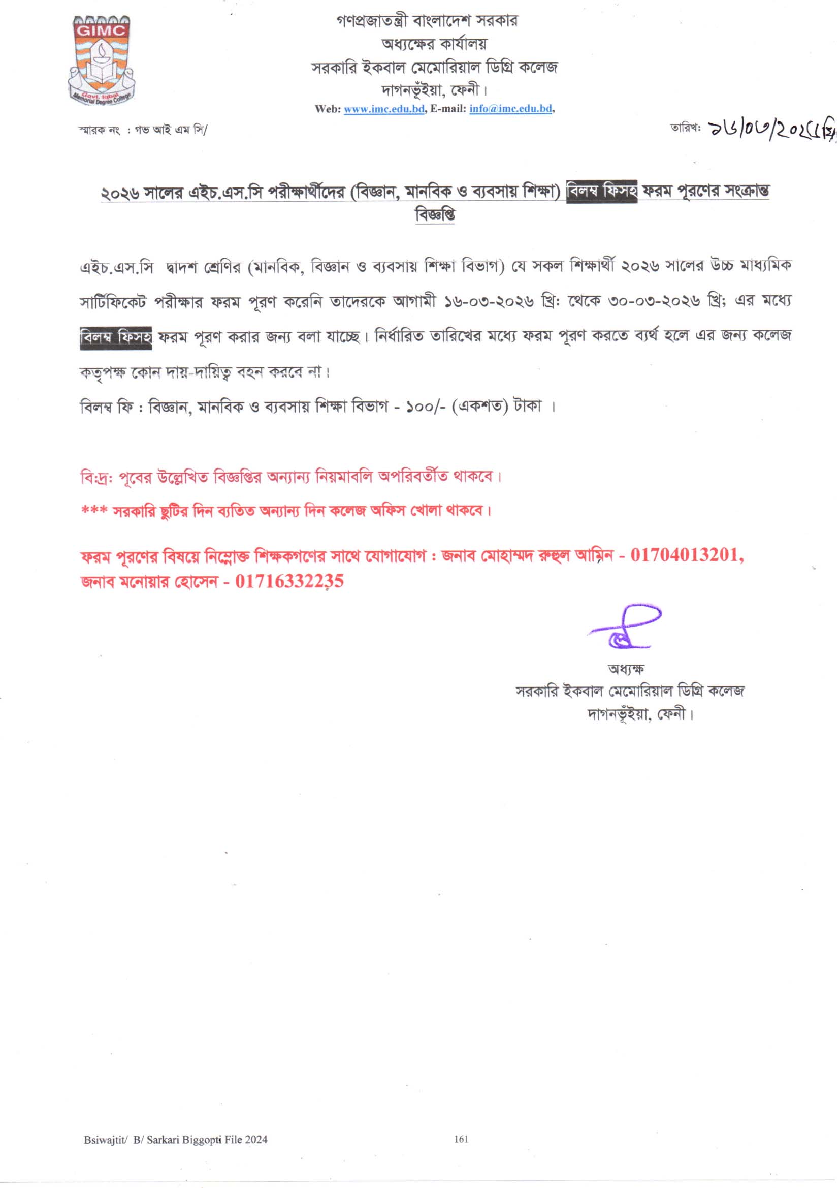 - এইচ.এস.সি পরীক্ষা- ২০২৬ এর বিলম্ব ফিসহ ফরম পূরনের বিজ্ঞপ্তি