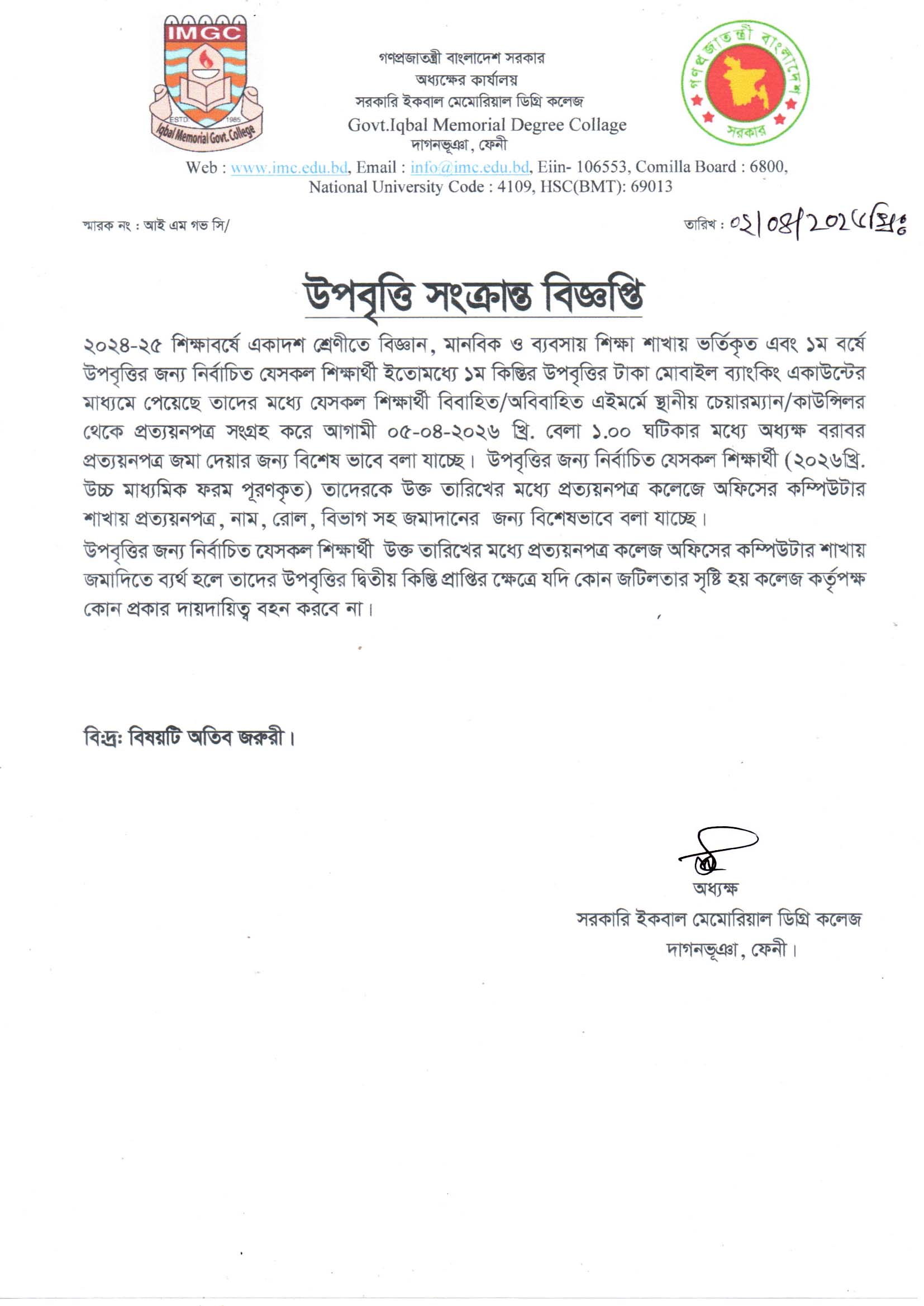 - দ্বাদশ শ্রেণির মানবিক , বিজ্ঞান ও ব্যবসায় শিক্ষা বিভাগের উপবৃত্তি সংক্রান্ত বিজ্ঞপ্তি - ২০২৬