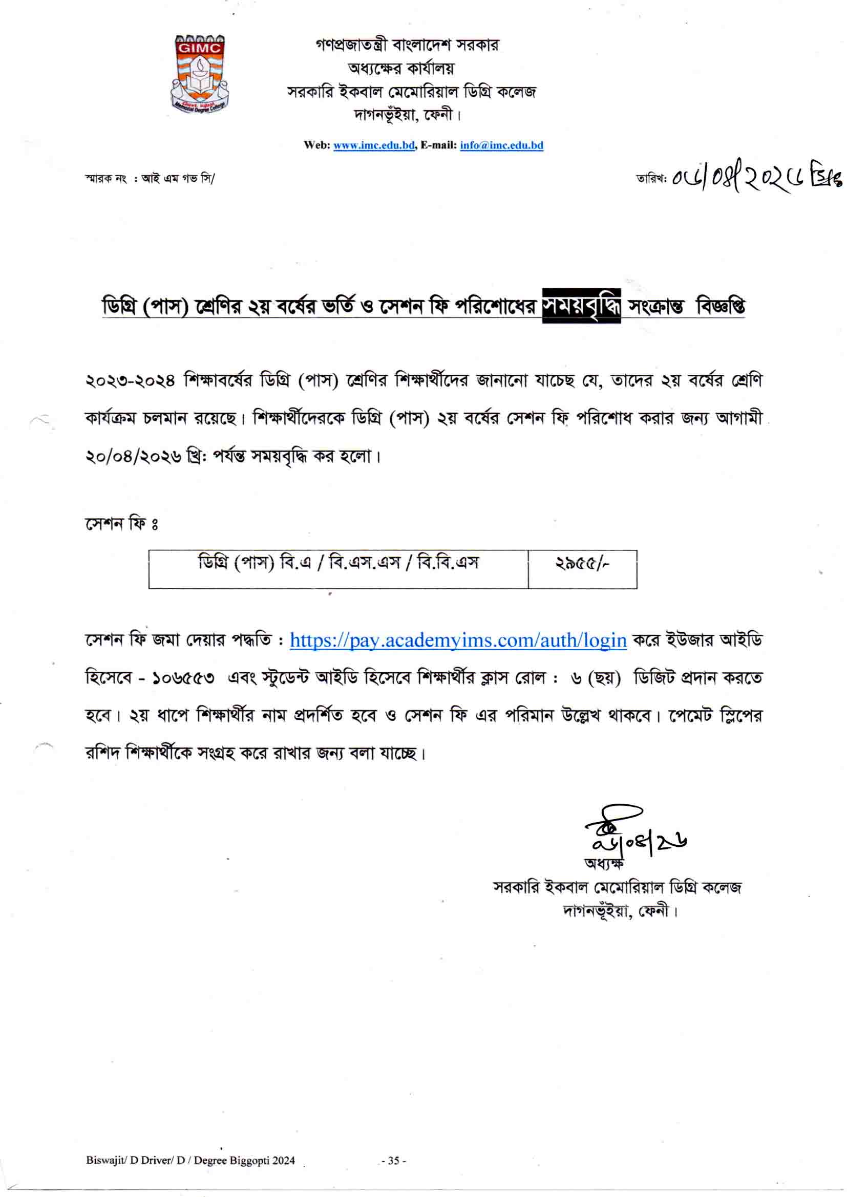 - ডিগ্রি (পাস) শ্রেণির ২য় বর্ষের ভর্তি ও সেশন ফি পরিশোধের সময়বৃদ্ধি সংক্রান্ত বিজ্ঞপ্তি