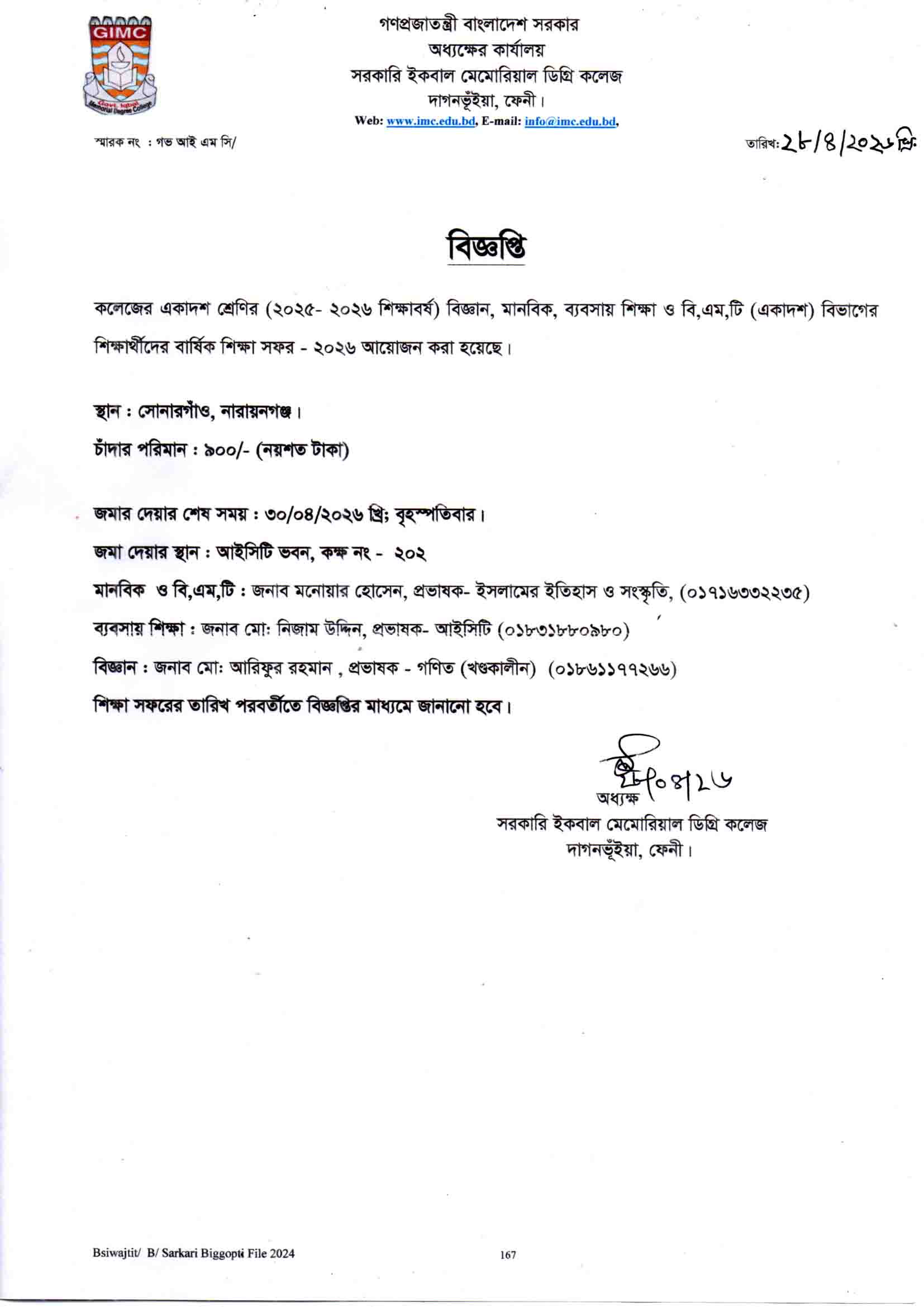 - শিক্ষা সফর- ২০২৬ এর সংশোধিত বিজ্ঞপ্তি