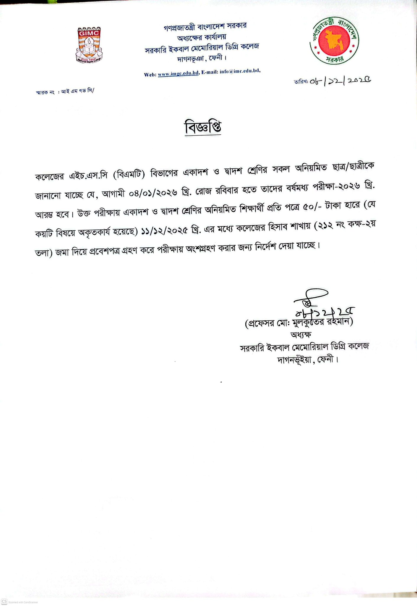 - এইচ.এস.সি (বি, এম, টি) বর্ষ মধ্য পরীক্ষার অনিয়মিত শিক্ষার্থীদের পরীক্ষার ফি সংক্রান্ত বিজ্ঞপ্তি - ২০২৬